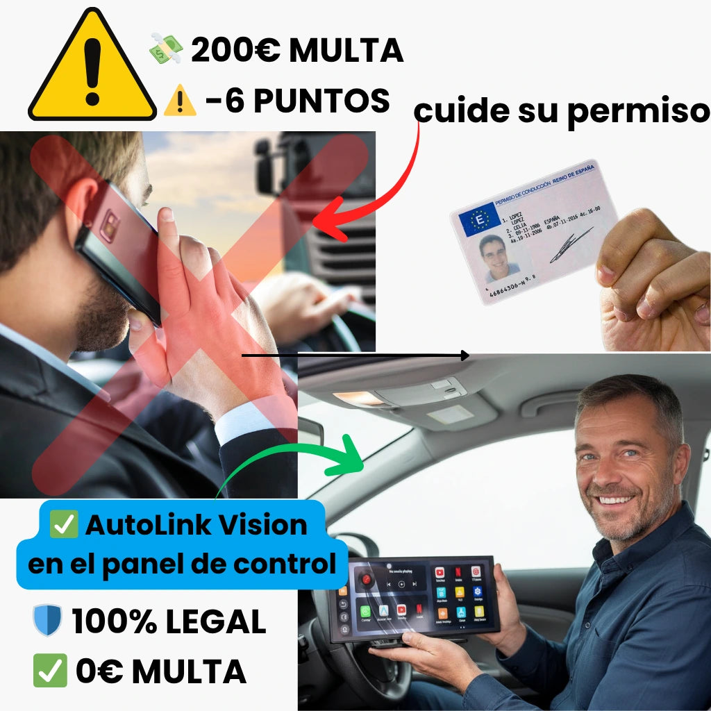 Usar el móvil al volante te cuesta 200€ y 6 puntos del carnet. Si vas al trabajo cada día o haces entregas, el riesgo se multiplica. Con AutoLink Vision, usas Spotify, Waze y WhatsApp de forma 100% legal gracias al control por voz. La Guardia Civil no puede multarte porque no tocas el móvil. Por solo 119€ (menos que una multa) proteges tu carnet y conduces sin preocupaciones.